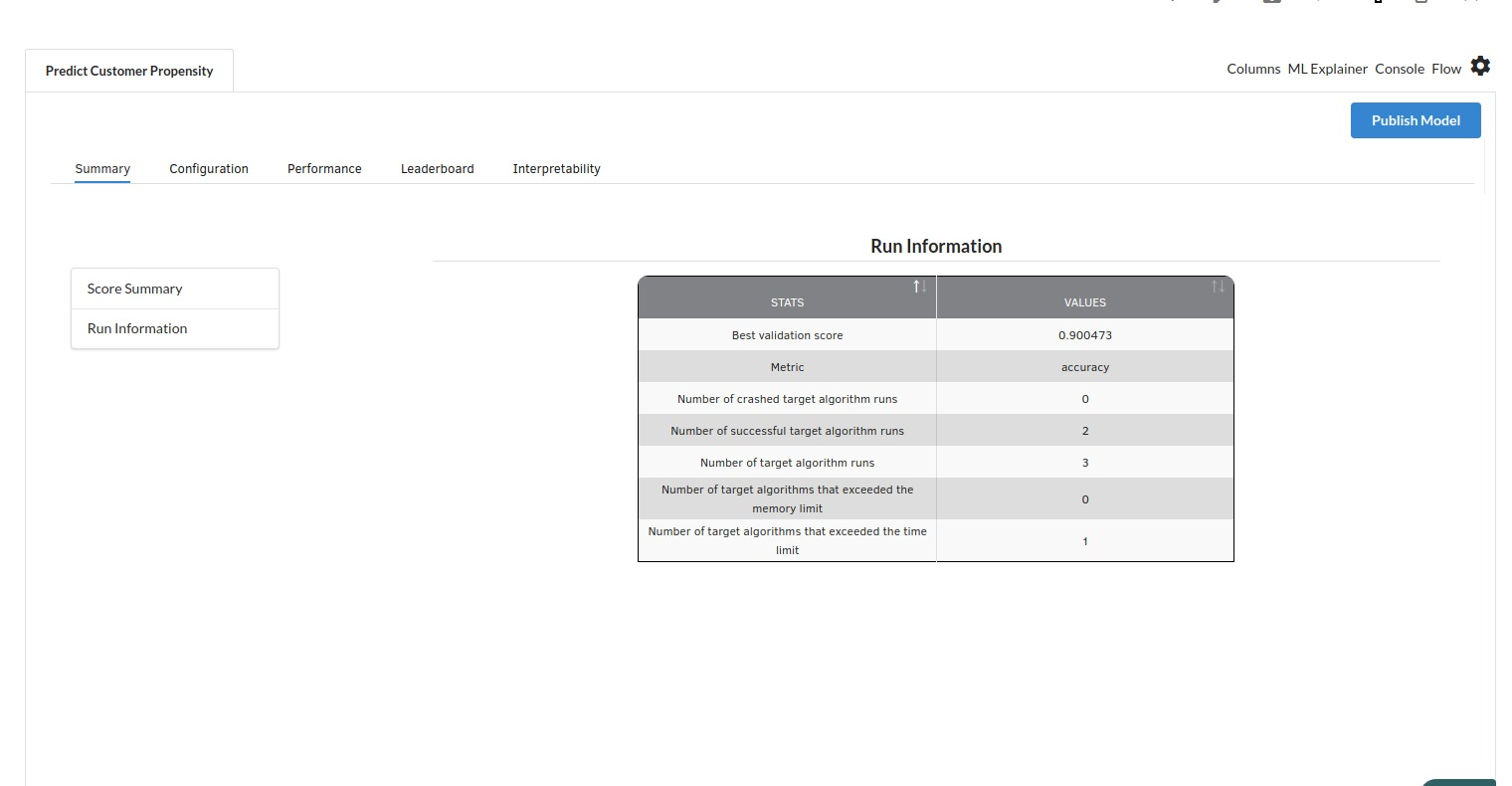 - The fourth view under Ml explainer is Leaderboard . In this view you can see the number of algorithms trained and all the feature engineering done on the algorithms used with ranking system to rank the best algorithm trained.