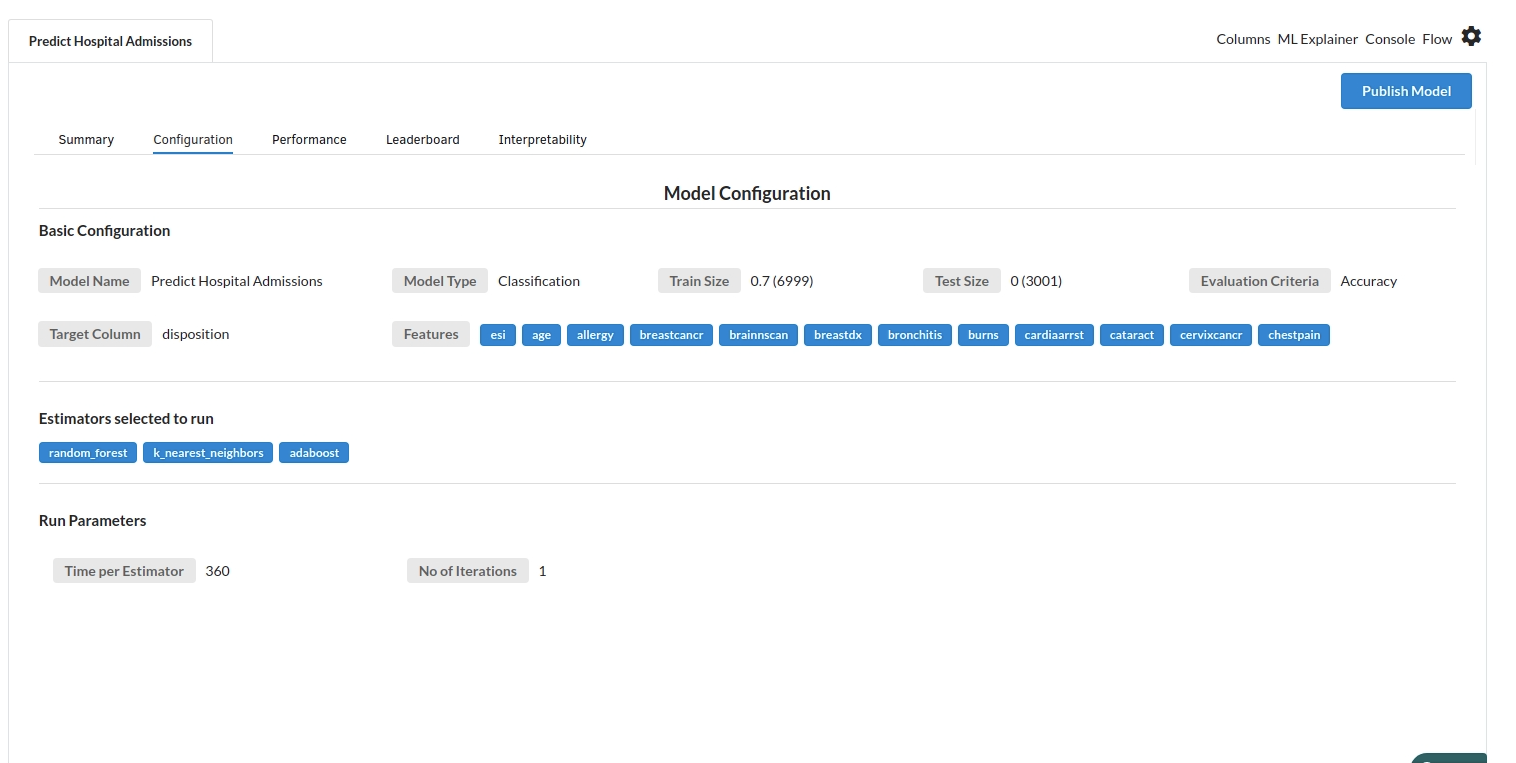 This usecase showcases how to create, train/test and deploy a Hospital admission prediction classification model. The datasets were obtained from a Korean triage study across 2 hospitals.It consists of a hospital admission dataset. Xceed will provide a NO-CODE environment for the end-to-end implementation of this project, starting with the uploading of datasets from numerous sources to the deployment of the model at the end point. All of these steps are built using Visual Workflow Designer, from analyzing the data to constructing a model and deploying it.