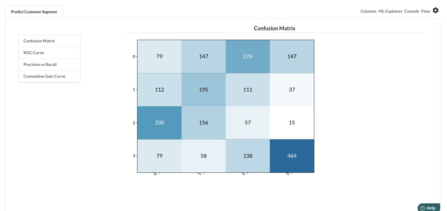 The third view under Ml explainer is Performance View . You can see confusion matrix ,ROC Curve, Precision vs Recall and Cumulative Gain Curve. Look at the built charts and decide if the charts are good enough for your model. The confusion matrix is a good indicator to understand how well your model was trained.