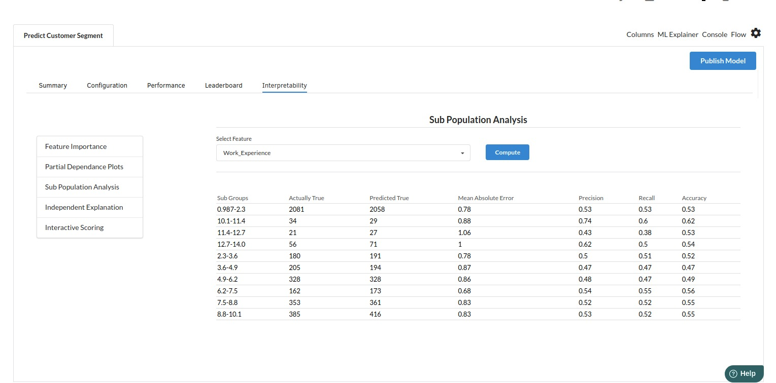 - The last view you see under ML explainer is Interpretability . In this view you will be able to interpret your model in simple terms where you will be getting results pertaining to feature importance , PDP Plots , Sub Population Analysis , Independant Explanation , Interactive Scoring . for more infomation on these results , refer to Interpretability . The Interpretability tab and the results under this tab would look like the one below.