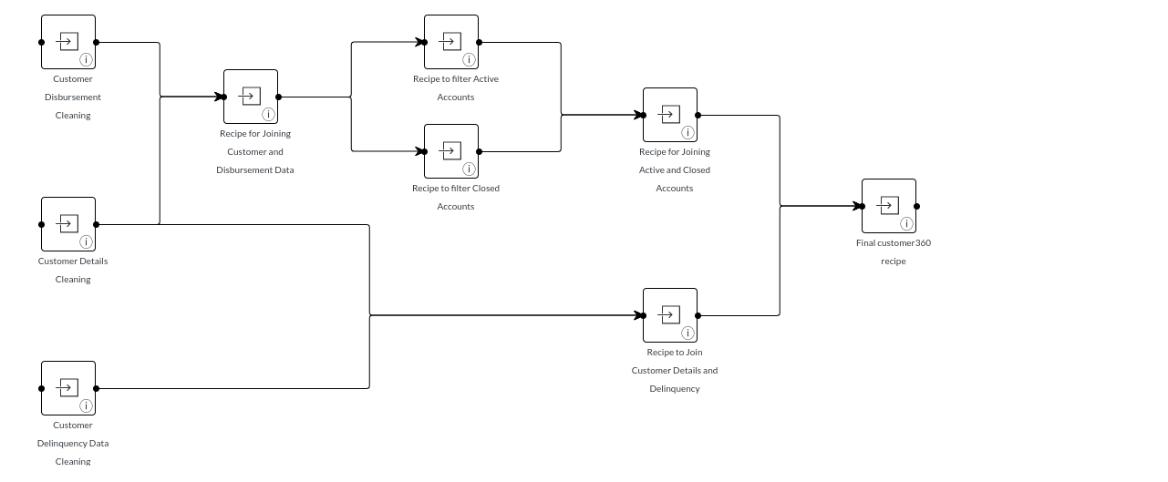 The Recipe flow is the visual representation of the steps created inside a recipe. It will simplify your understanding of the steps created. In some cases there may be multiple join tables , filter records or Groupby and Aggregate used in the flow which requires some understanding even for the one creating the workflow. The recipe flow will help you understand the step flow and also helpful to one understanding the workflow steps. Recipe flow as you can see will be in a micro level.
